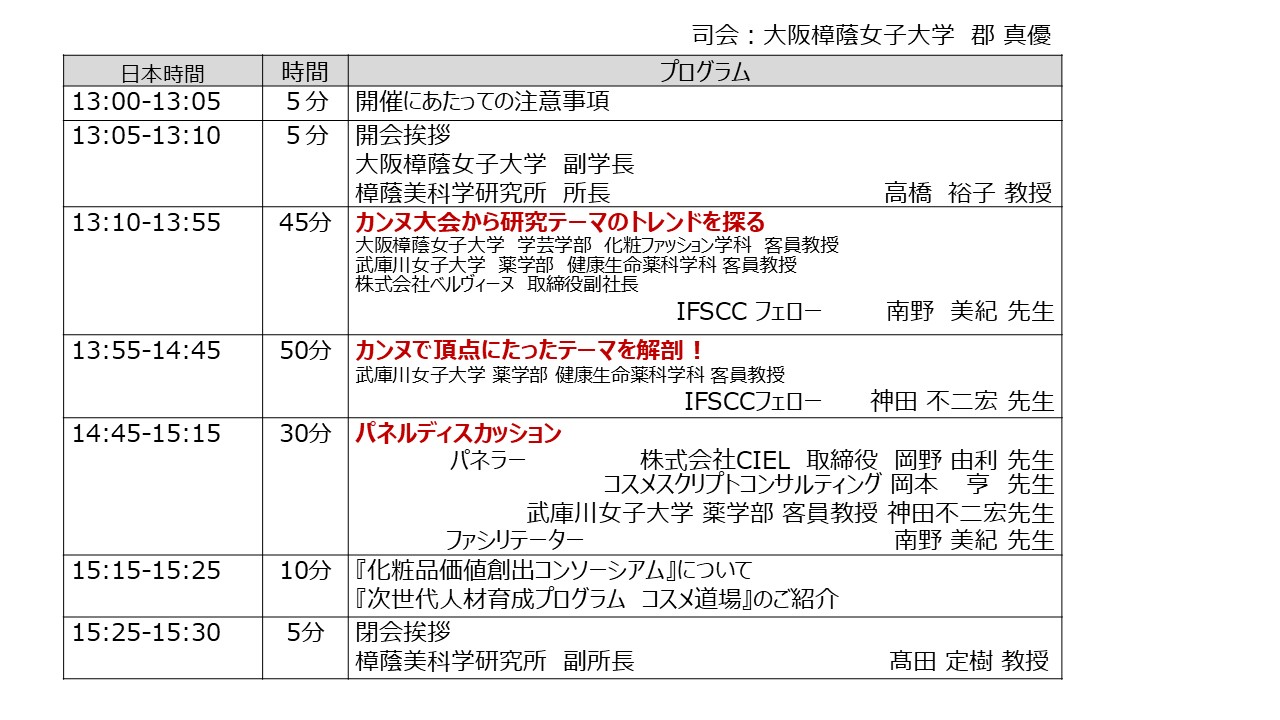 9月9日の本ブログで予告した、無料webinar「カンヌから見えた化粧品の未来」がいよいよ来週の金曜日に開催されます。そういえば、詳細のプログラムをお知らせしていないことに今頃気が付きましたので、再度告知させていただきます。今年はゲストをお迎えして、「なぜ日本の口頭発表が少なかったのか?これからの日本の研究に求められることは?」についてパネルディスカッションを開催します。まだお申込みされていない方は、お早めに申し込みの上、ご視聴ください。なお録画に失敗しなければ、昨年同様、後日オンディマンドで公開します。オンディマンドでご視聴をご希望される方もお申込みが必要です。多くの方にご視聴いただき、セミナー終了後に、これからの日本の研究の進むべき道についてご意見もいただきたいと思っています。お楽しみに。(南野美紀/神田不二宏)