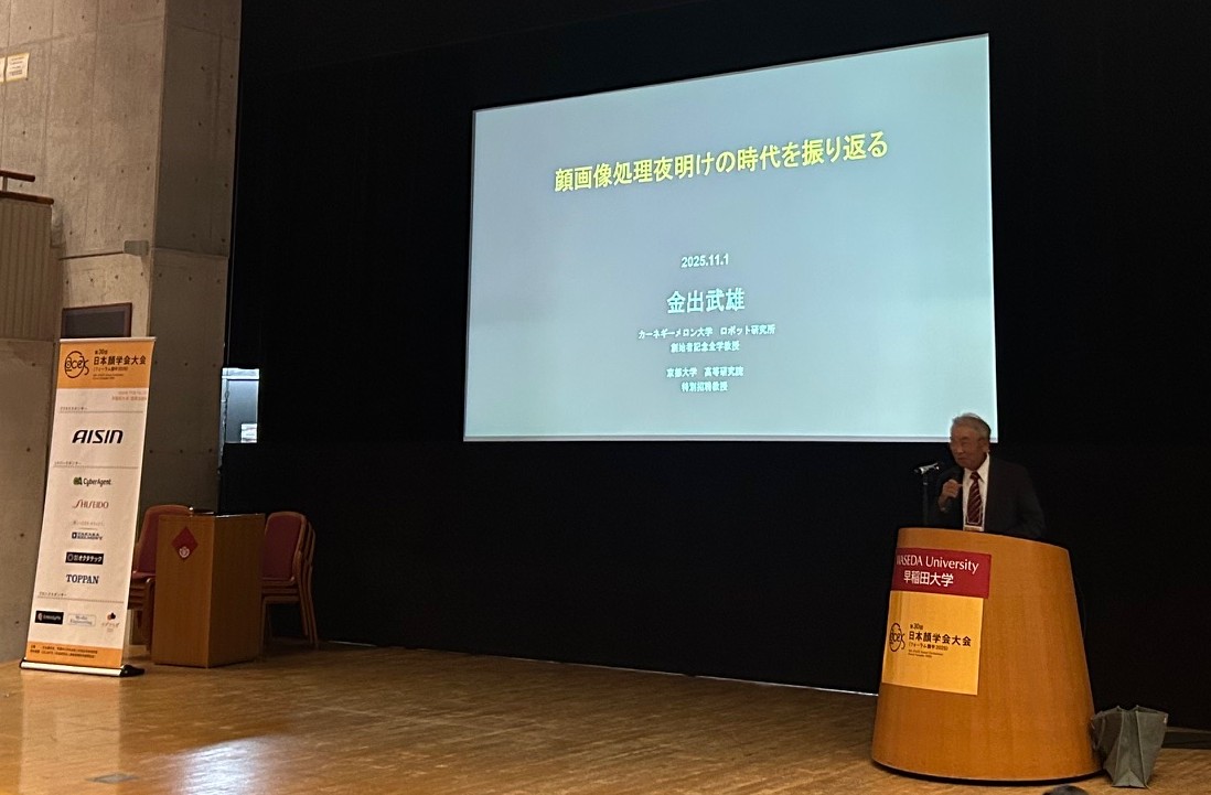 金出武雄先生は、コンピュータビジョンとロボット工学の世界的権威であり、カーネギーメロン大学の創始者記念全学教授として、人工知能や自動運転技術の基盤を築いた超有名な先生です。第30回日本顔学会大会フォーラム顔学2025の大会長、早大森島繁生教授の師匠という関係から、今回、特別に講演を引き受けられ、「顔画像処理夜明けの時代を振り返る」というテーマでご講演されました。