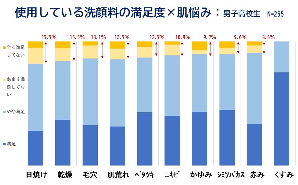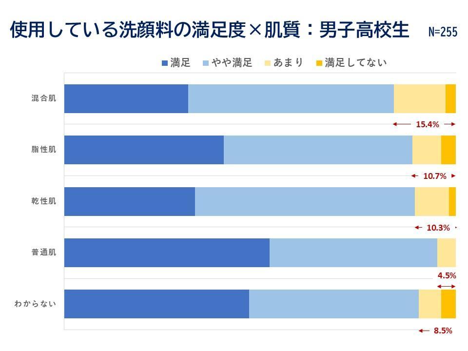 皮脂が多くテカリやすい混合肌・脂性肌は、男子高校生に多い肌質です。にもかかわらず、ここで満足度が下がっているということは、「しっかり洗っているのに、悩みは残っている」という“もどかしさ”がみえてきます。