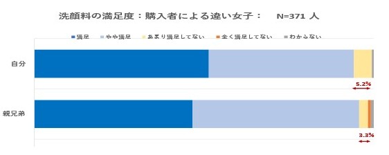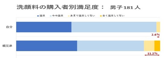 自分で購入した場合は、洗顔料の不満足度2.6%に対し、親や兄弟等が購入した場合は、不満足度が11.2%であるという結果です。