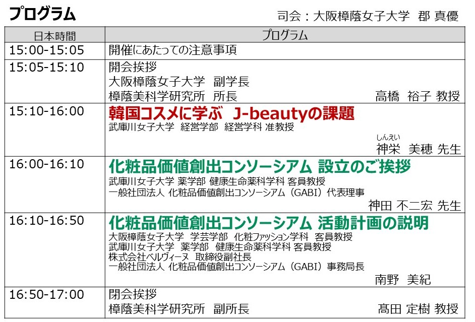 テーマは「これからのJ-Beautyを考えよう」で、前半は、武庫川女子大学経営学部の神栄美穂先生をお招きし、「韓国コスメに学ぶ J-beautyの課題」についてご講演をしていただきます。後半は、化粧品価値創出コンソーシアムの設立趣旨説明とこれからの活動計画について紹介します。オンディマンドでの配信も予定しておりますので、まずはお申込みを!(南野美紀)
