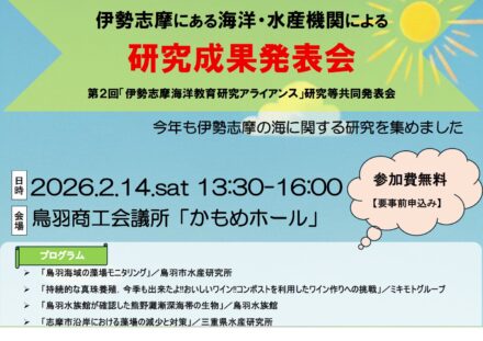 - 来る2月14日(土)、三重県伊勢志摩地域において、海洋環境を対象とした産官学連携による研究成果発表会が開催されます。 伊勢志摩地域では、大学や研究機関、自治体、地域と関わりながら研究・実践を行う組織が...続きを読む